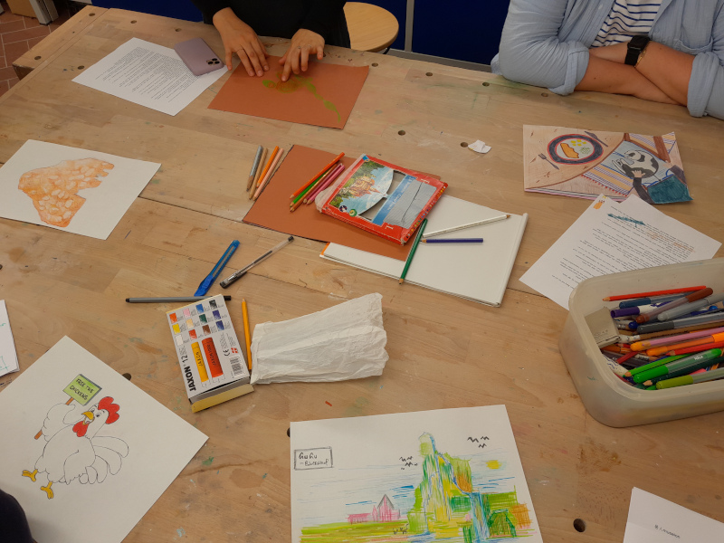 Kurz vor den Herbstferien jedoch fand ein weiterer Workshop für das Aska-Kollegium statt, der den Titel "Interkulturelles kreatives Arbeiten – ein Workshop zur Mensch-Tier-Beziehung" trug. Ausgangspunkt waren Werke der Künstlerin, die sich ebendieser Beziehung widmen. Es wurde gezeichnet und gemalt, wobei originelle und sehr unterschiedliche Ergebnisse entstanden sind.